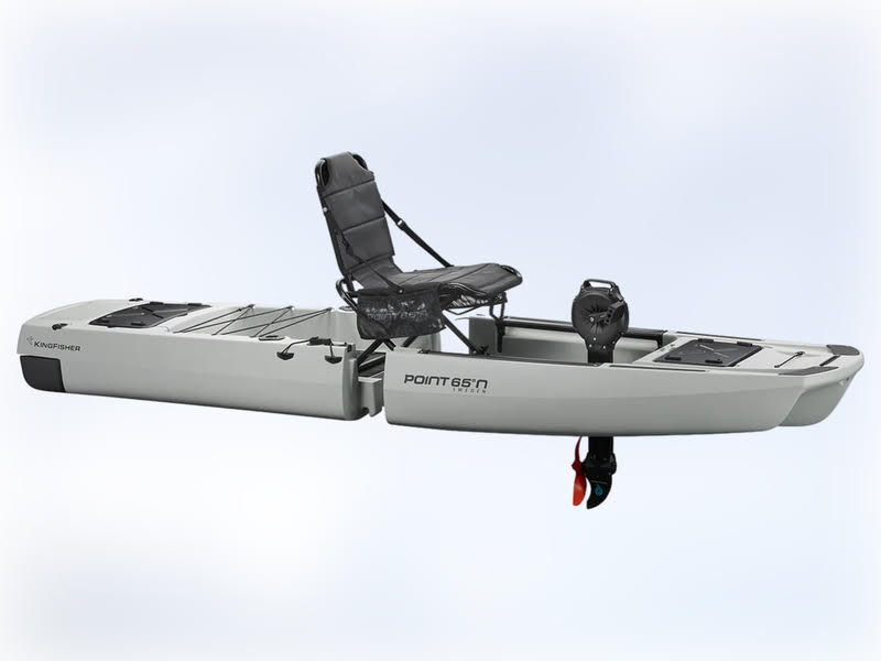 The waterproof pod stores electronics and tackle, while the bow hatch holds rods and gear securely.